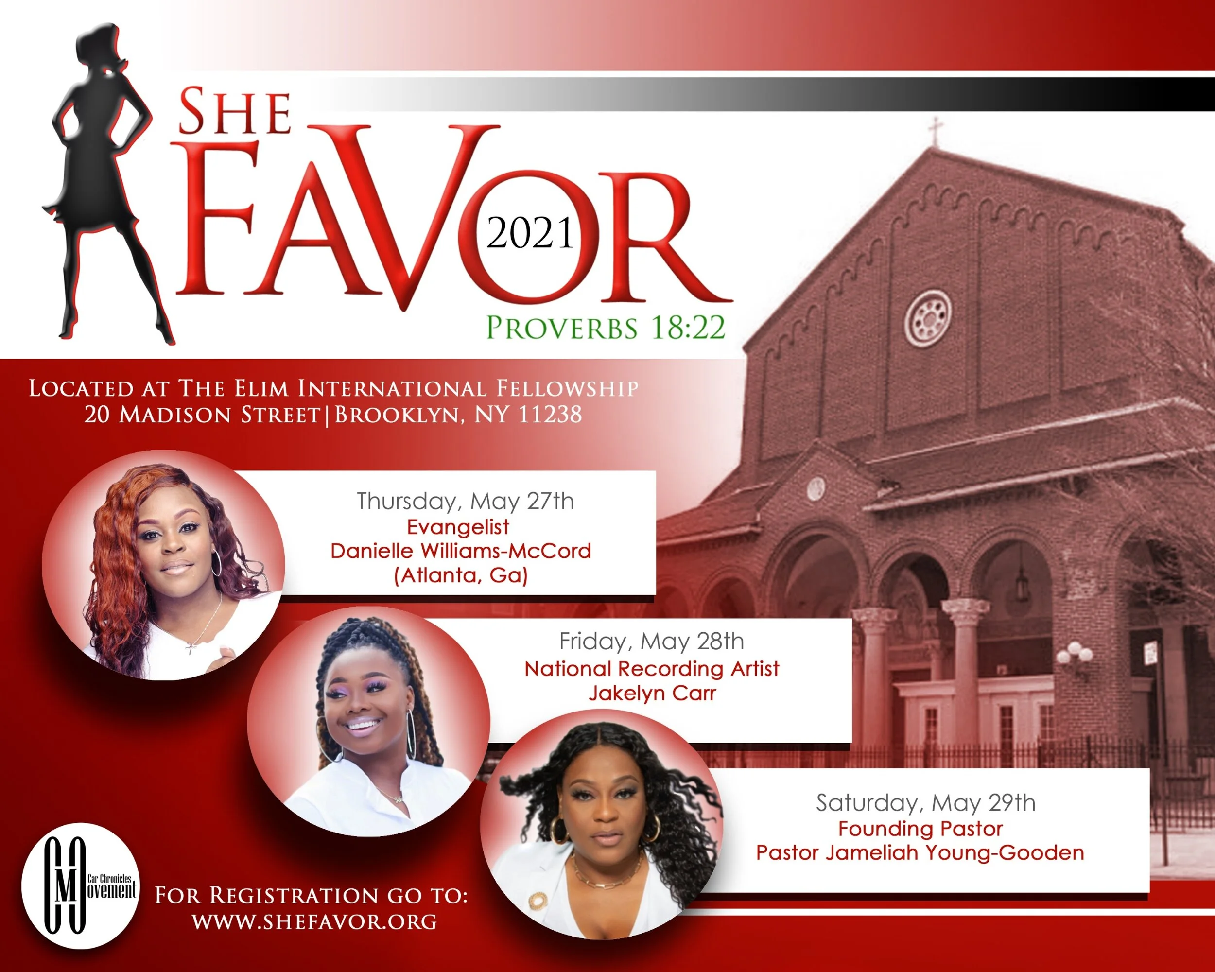 SheFavor 2021 Brooklyn Thursday, May 27, 2021 7:00 PM Saturday, May 29, 2021 8:00 PM Elim International Fellowship 20 Madison Street Brooklyn, NY 11238 (map) Google Calendar ICS Click here for more information
